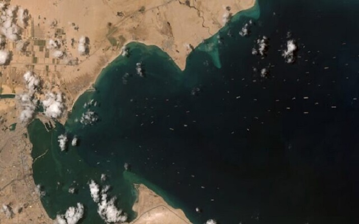 Ảnh vệ tinh cho thấy hàng trăm tàu chờ Ever Given được giải cứu. (Ảnh: AP)
