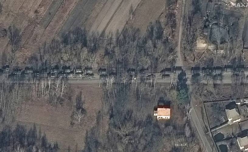 Ảnh vệ tinh chụp dàn phương tiện của Nga di chuyển về thủ đô Kiev. (Ảnh: Reuters)
