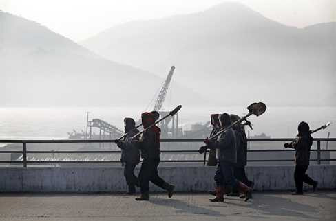 | Nhóm công nhân mang dụng cụ lao động của họ trên đường phố Bình Nhưỡng. |