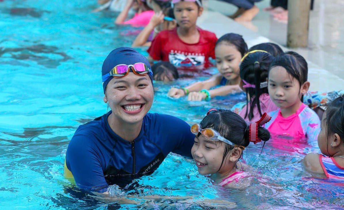 Ánh Viên trực tiếp dạy bơi cho trẻ em.