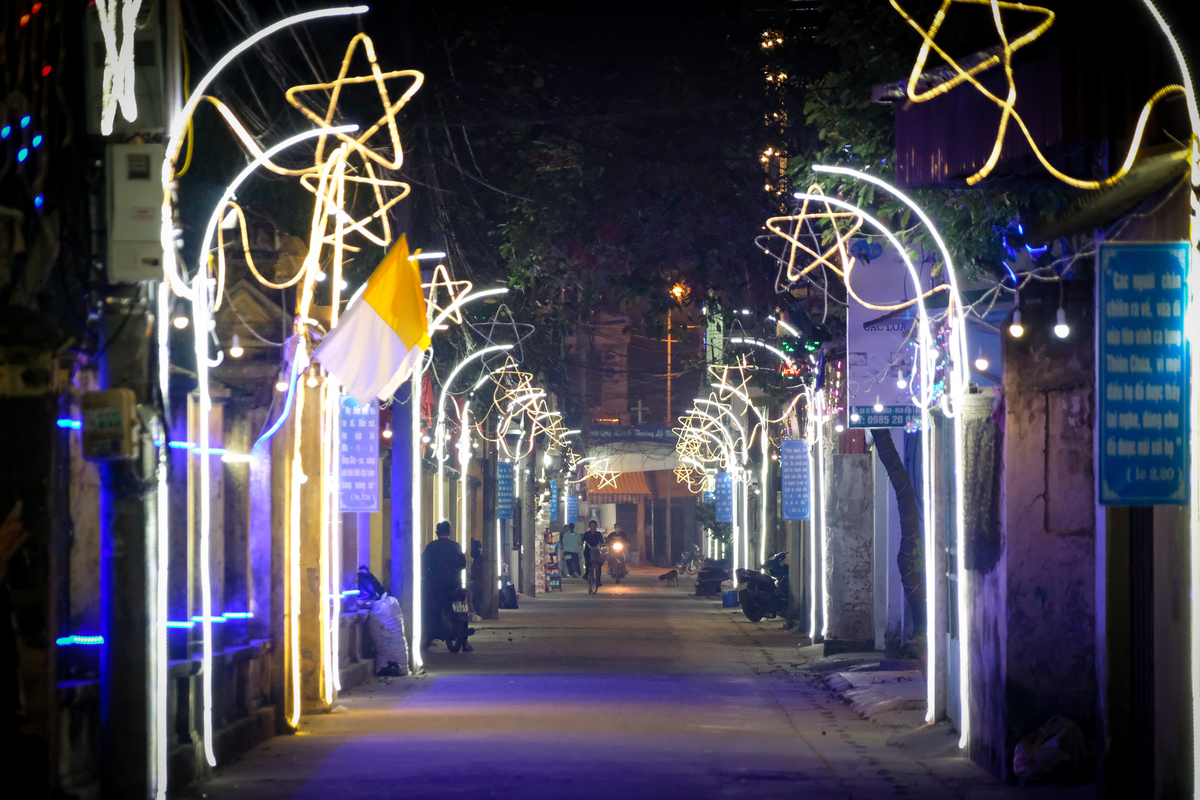 Khoảng 2 tuần trước Giáng sinh, gần 600m đèn nháy và dây trang trí được người dân treo dọc các con đường hướng về giáo xứ Thạch Bích.