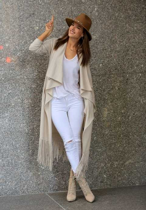 | Alessandra Ambrosio khoe dáng năng động, khỏe khoắn với áo khoác tua rua, cổ xếp nếp cùng tông với giày bốt cột dây và nguyên bộ đồ trắng trước tòa nhà của Victoria's Secret. Hiện nay người đẹp đang ráo riết chuẩn bị cho show diễn "thần thánh" hàng năm của hãng đồ lót nổi tiếng này. |