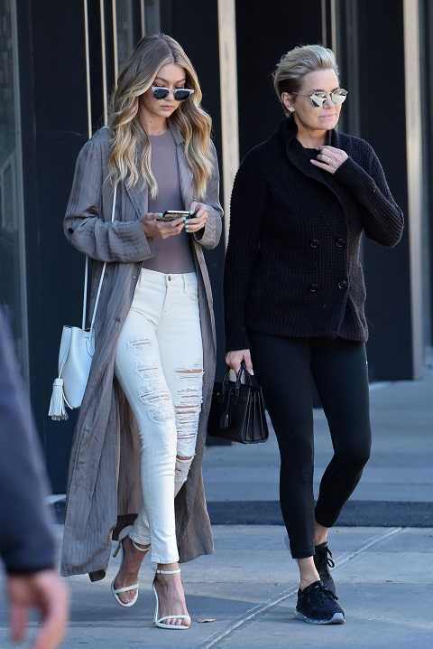 | Chiếc áo dài sát đất không làm khó được chân dài Gigi Hadid mà còn tôn dáng cao ráo của cô nàng. Thiên thần sẽ góp mặt trong show diễn Victoria's Scret sắp tới đến New York để tập luyện, cô phối áo khoác với áo thun cùng tông với áo khoác, quần jeans trắng rách và ankle-strap. |
