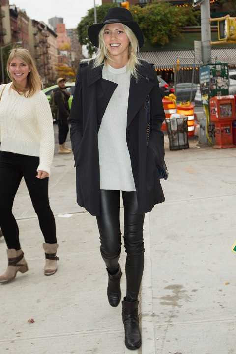 | Devon Windsor mạnh mẽ hơn với set đồ phảng phất phong cách military: áo sợi dài, quần da bó, giày bốt, áo khoác xanh navy có cầu vai. |