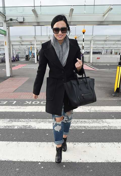 | Demi Lovato rất "chịu chơi" dù trời lạnh vẫn diện quần jeans rách. Để cân bằng lại, nữ ca sĩ phối quần jeans với áo khoác dài đen, khăn choàng xám, kính oversize, túi Celine. |