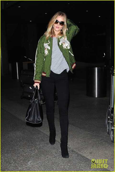 | Rosie Huntington-Whiteley sành điệu tại sân bay LAX với áo khoác bomber nằm trong bộ sưu tập Resort 2016 của Chloe phối với áo T-shirt xám, quần skinny và giày bốt đen. |