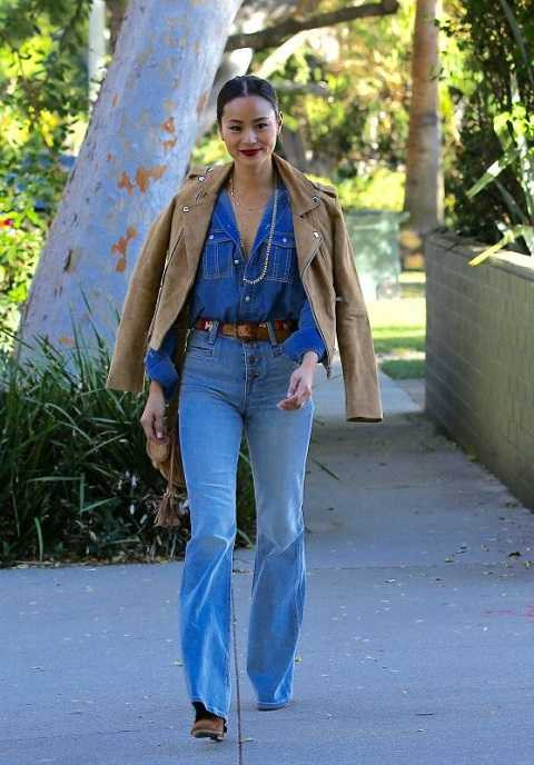 | Jamie Chung lịch lãm và cổ điển với áo khoác da lộn với set đồ denim-on-denim trên phố West Hollywood cuối tuần qua. |