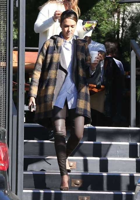 | Jessica Alba vô cùng ấm áp với phong cách layer với sự kết hợp hài hòa của áo khoác dạ ca-rô, áo sơ-mi và áo ghi-lê. |
