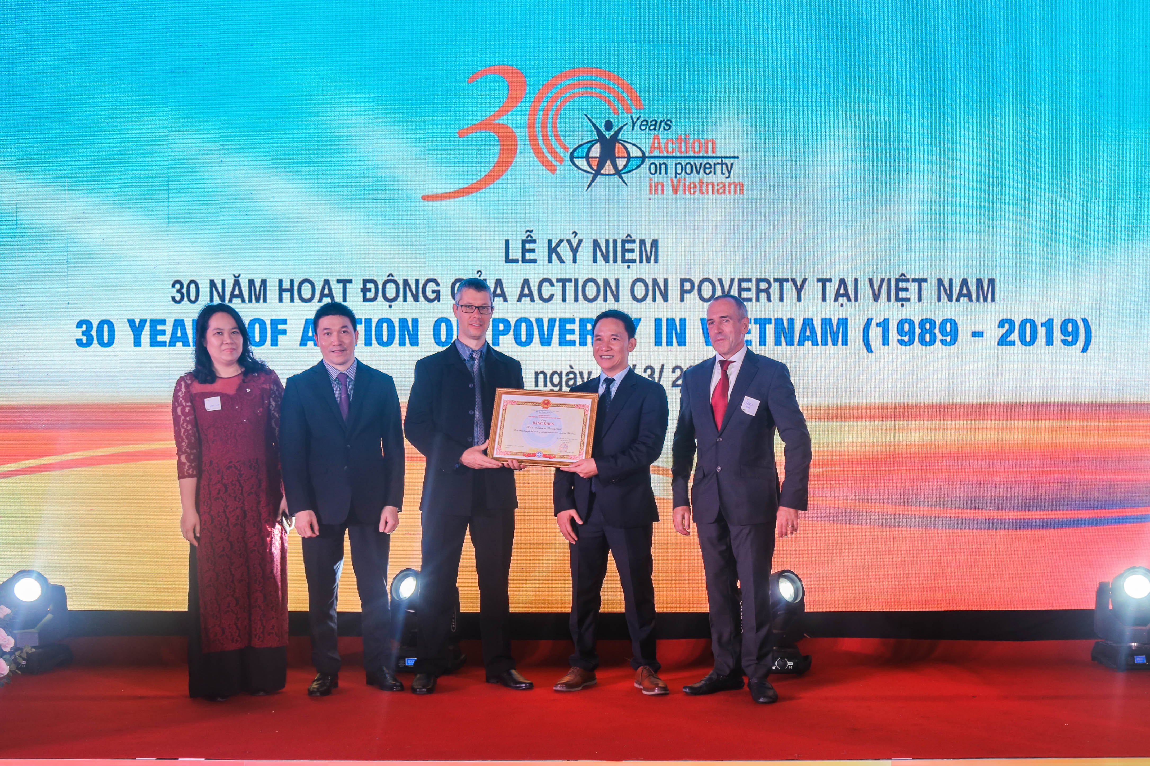 Nhân dịp này, ông Phan Anh Sơn, Trưởng Ban Điều phối Viện trợ Nhân dân (PACCOM), đại diện Liên hiệp các Tổ chức Hữu nghị Việt Nam (VUFO) đã trao Bằng khen của Liên hiệp cho tổ chức AOP và kỉ niệm chương cho các cá nhân có đóng góp cho công tác xoá đói giảm nghèo tại Việt Nam.