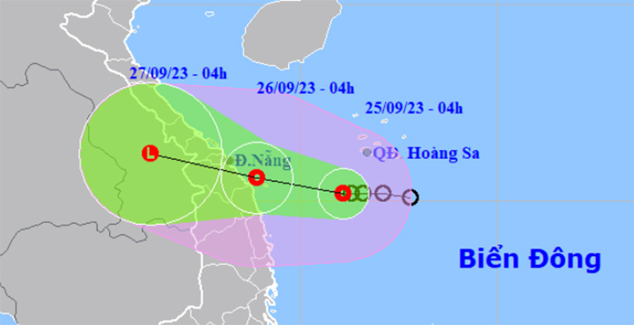 Dự báo đến 4h ngày 26/9, ATNĐ trên vùng biển từ Đà Nẵng đến Quảng Ngãi, di chuyển theo hướng Tây Tây Bắc, mỗi giờ đi được 10-15 km. Khu vực chịu ảnh hưởng: Phía Tây Nam của Bắc Biển Đông và phía Tây Bắc khu vực giữa Biển Đông, vùng biển từ Quảng Trị đến Quảng Ngãi.
