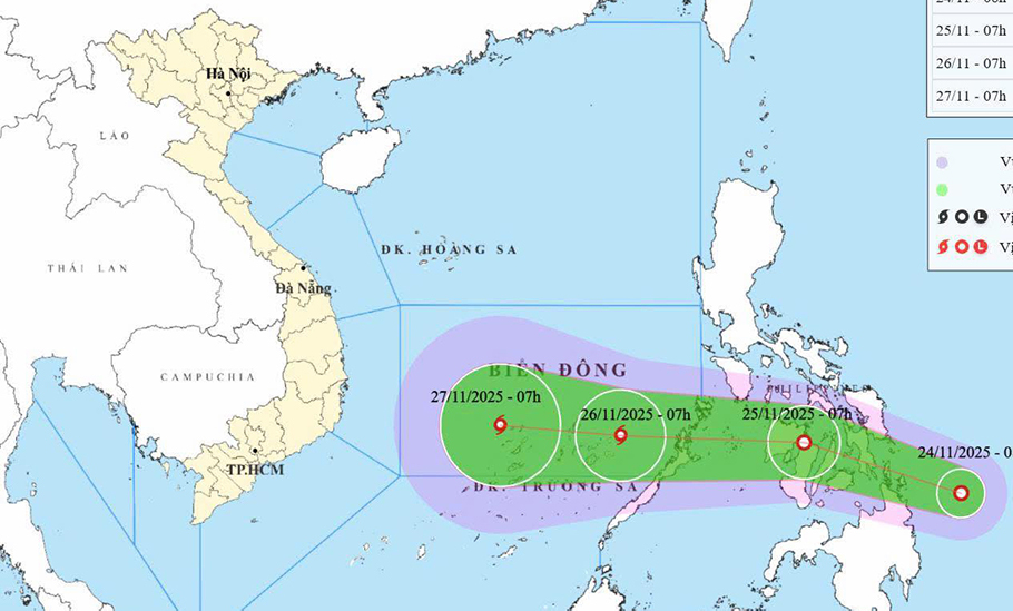 "Cường độ mạnh nhất dự kiến khi đi qua khu vực phía Bắc đặc khu Trường Sa có thể đạt cấp 10, giật cấp 13. Sau đó, bão di chuyển theo hướng Tây, hướng về đất liền Nam Trung Bộ, trọng tâm ảnh hưởng từ khu vực Gia Lai đến Lâm Đồng (vùng từ Bình Định đến Bình Thuận cũ), thời gian ảnh hưởng chính trong khoảng 28-30/11", cơ quan khí tượng thông tin.