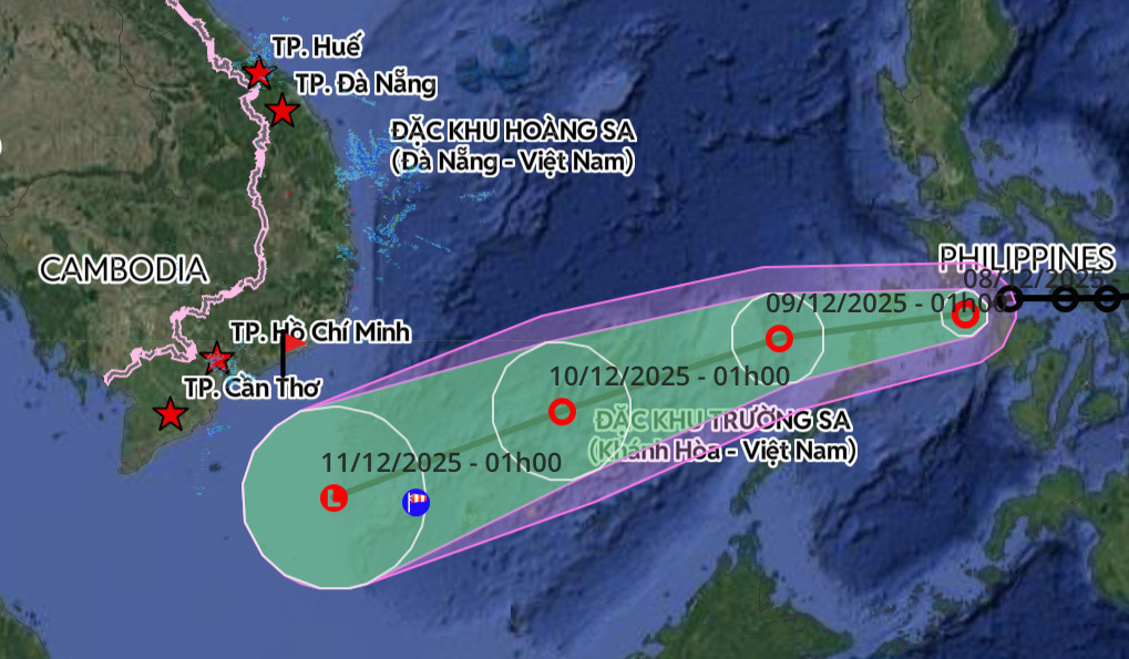 Khoảng 1h ngày 9/12, tâm áp thấp nhiệt đới trên vùng biển phía Đông Nam khu vực giữa Biển Đông, giữ nguyên hướng di chuyển Tây Tây Nam và xu hướng di chuyển nhanh hơn, mỗi giờ đi được khoảng 15-20km, cường độ áp thấp nhiệt đới duy trì cấp 6, giật cấp 8.
