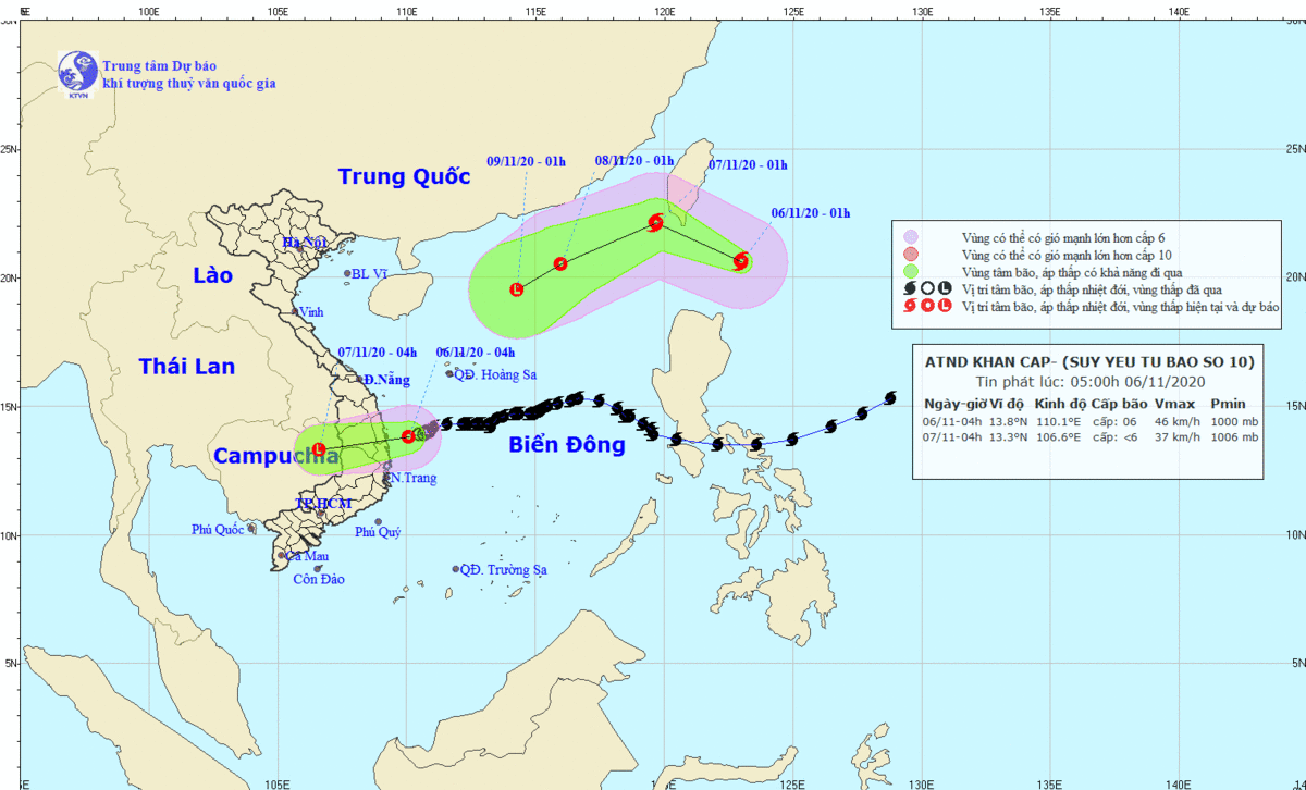 Đến 4h ngày 7/11, vị trí trung tâm vùng áp thấp ở khoảng 13,3 độ Vĩ Bắc; 106,6 độ Kinh Đông, trên khu vực Campuchia. Sức gió mạnh nhất ở trung tâm vùng áp thấp giảm xuống dưới cấp 6 (dưới 40km/h). Vùng nguy hiểm trên biển trong 24 giờ tới (gió mạnh từ cấp 6 trở lên, giật từ cấp 8 trở lên): từ vĩ tuyến 12,0 đến 16,0 độ Vĩ Bắc; phía Tây kinh tuyến 112,5 độ Kinh Đông.