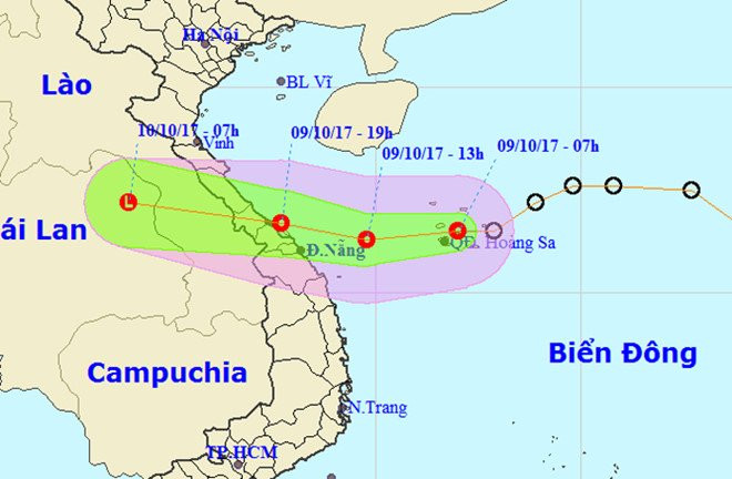 Đến 22h ngày 9/10, vị trí tâm bão ở vào khoảng 17,0 độ Vĩ Bắc; 108,5 độ Kinh Đông, trên vùng biển các tỉnh từ Hà Tĩnh đến Quảng Trị. Sức gió mạnh nhất ở vùng gần tâm bão mạnh cấp 8 (60-75km/giờ), giật cấp 10.