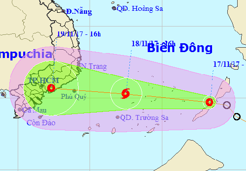 Trong 24 giờ tới, áp thấp nhiệt đới di chuyển theo hướng Tây Tây Bắc với tốc độ 25-30 km/h và có khả năng mạnh lên thành bão. Đến 16h ngày 18/11, tâm bão ở trên khu vực phía Tây quần đảo Trường Sa, cách đảo Phú Quý khoảng (Bình Thuận) 370 km về phía Đông. Sức gió mạnh nhất mạnh cấp 8 (60-75km/h), giật cấp 11.