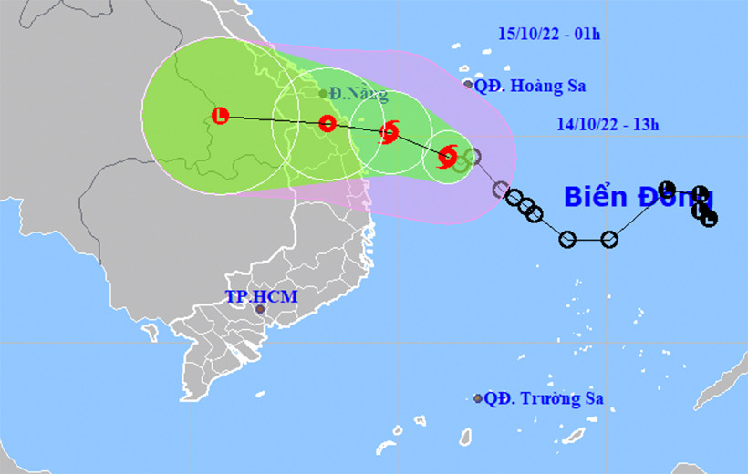 Đến 1h ngày 15/10, bão số 5 trên vùng biển các tỉnh Thừa Thiên Huế - Quảng Ngãi, cách Đà Nẵng - Quảng Ngãi khoảng 90km về phía Đông. Sức gió mạnh nhất vùng gần tâm bão mạnh cấp 8, giật 10, dự báo hướng vào đất liền Đà Nẵng - Quảng Ngãi, sau đó suy yếu thành áp thấp nhiệt đới.
