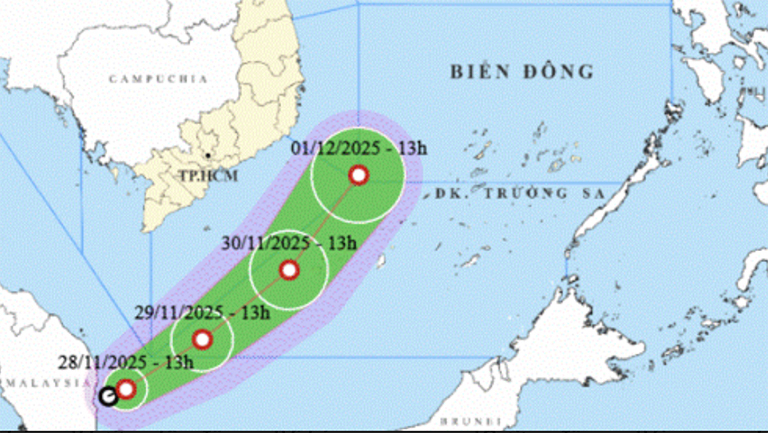 Dự báo đến 13h ngày 29/11, áp thấp nhiệt đới khả năng đi vào vùng biển phía Tây Nam khu vực Nam Biển Đông, di chuyển theo hướng Đông Bắc, mỗi giờ đi được khoảng 15km. Sức gió mạnh nhất vùng gần tâm áp thấp mạnh cấp 7, giật cấp 9.