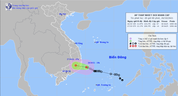 Theo Trung tâm Dự báo KTTV quốc gia, lúc 19h ngày 26/10, vị trí tâm áp thấp nhiệt đới ở vào khoảng 11,8 độ Vĩ Bắc; 110,2 độ Kinh Đông, cách Khánh Hòa khoảng 140km, cách Ninh Thuận khoảng 130km. Sức gió mạnh nhất vùng gần tâm áp thấp nhiệt đới mạnh cấp 7 (50-60km/giờ), giật cấp 9. Bán kính gió mạnh từ cấp 6, giật từ cấp 8 trở lên vào khoảng 100km tính từ tâm áp thấp nhiệt đới.
