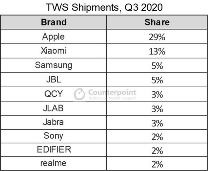 Apple vẫn đang duy trì vị trí dẫn đầu vượt trội trên thị trường tai nghe không dây năm 2020. Theo hãng nghiên cứu Counterpoint Research mới công bố, tai nghe không dây của Apple chiếm 29% tổng doanh số sản phẩm này trong quý 3/2020.