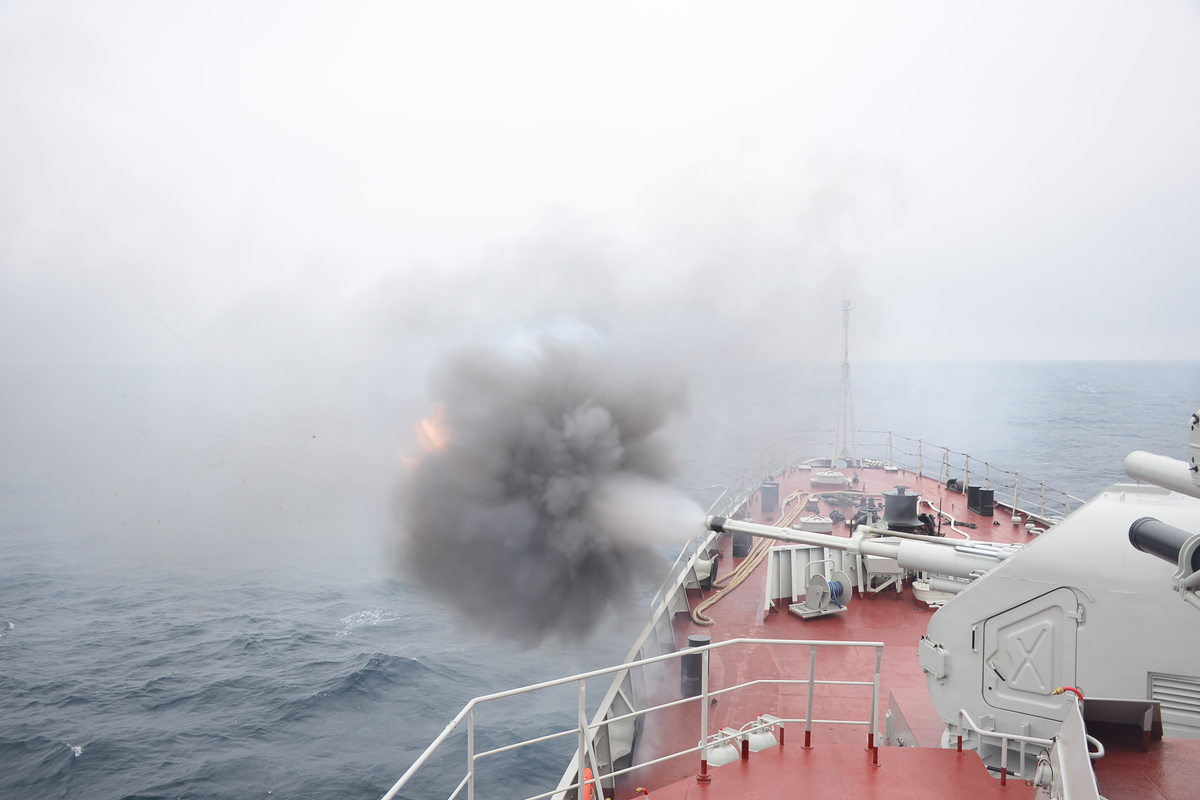 Pháo AK-176 trên Tàu 016-Quang Trung khai hỏa tiêu diệt mục tiêu trong bài bắn pháo đối hạm. (Ảnh: Quân đội Nhân dân)