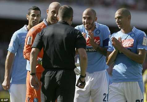 | Các cầu thủ Napoli phản ứng quyết định thổi penalty của trọng tài Friend. |