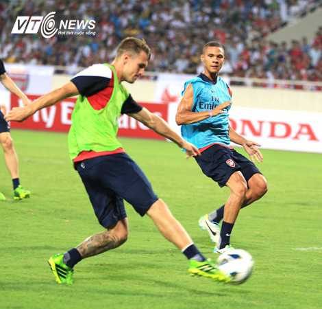 | Kieran Gibbs (áo xanh lam) trong đội hình Arsenal tham gia buổi tập chiều qua tại Mỹ Đình (Ảnh: Quang Minh) |
