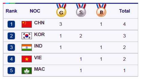 Với 1 HCĐ và 1 HCB tới thời điểm này, Đoàn Thể thao Việt Nam đã vươn lên vị trí thứ 4 trên bảng tổng sắp huy chương tính đến 11h30’ trưa nay.