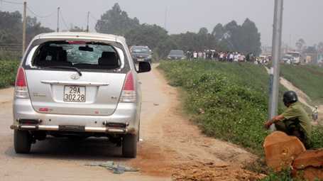 | Một trong 5 chiếc xe ô tô bị đập vỡ cửa kính bỏ lại trên đê. |