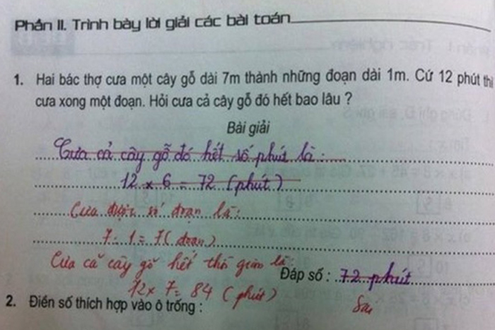 Học sinh đã đưa ra cách giải: "Cưa cả cây gỗ đó hết số phút là: 12 x 6 = 72 phút". Tuy nhiên cách làm này bị cô giáo gạch sai và thay bằng đáp án: "Cưa được số đoạn là: 7x1=7 đoạn. Cưa cả cây gỗ hết thời gian là 12x7=84 phút".