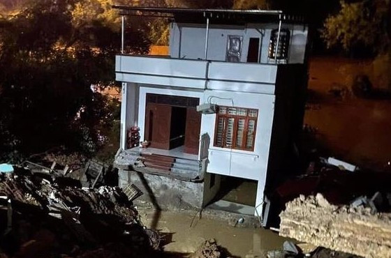 Ngôi nhà 3 tầng sụt hẳn xuống sông Thương. (Ảnh: Zing)