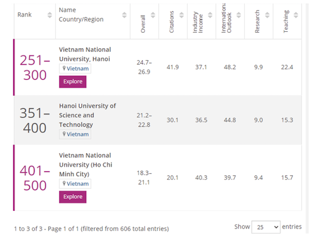 Thứ hạng của 3 trường đại học của Việt Nam trong bảng xếp hạng THE năm 2021.