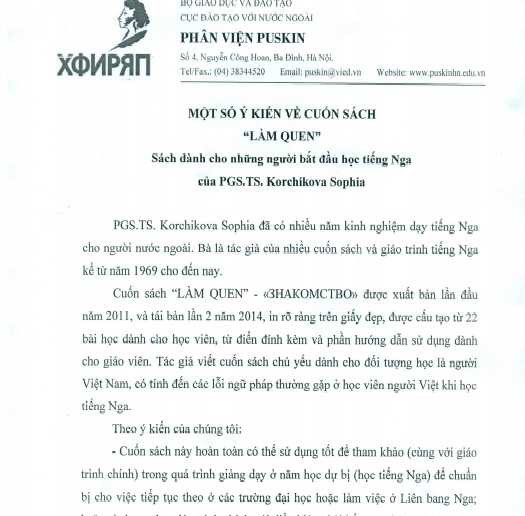 Bên cạnh đó, Phân viện Pushkin đã tham khảo cả ý kiến của chuyên gia người Nga đang công tác tại Phân viện để nhận xét về cuốn giáo trình.