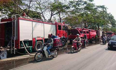 | Nhận được tin báo, lực lượng PCCC điều động nhiều phương tiện chuyên dụng cùng hàng chục chiến sỹ đến hiện trường dập lửa |