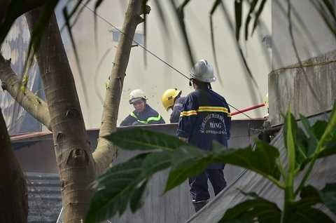 | Lực lượng chữa cháy leo lên mái nhà tiếp cận ngọn lửa |
