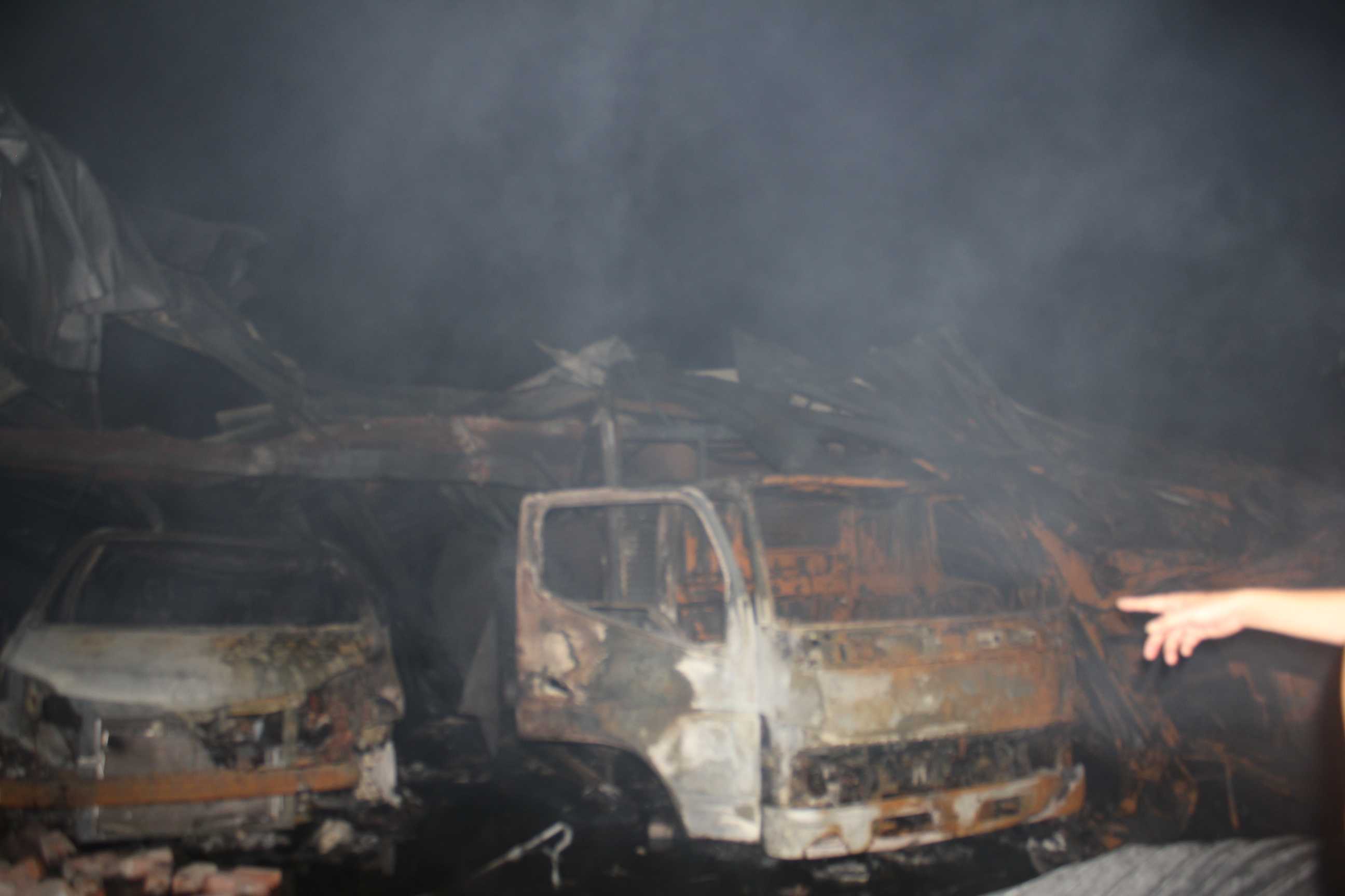 Tại hiện trường, vụ cháy đã gây thiệt hàng tỷ đồng với toàn bộ khu xưởng đổ sập, 500 tấm nệm mút thành phẩm, 2 xe ô tô, 10 máy cắt, ép nệm và nhiều vật dụng đã bị thiêu rụi hoàn toàn.