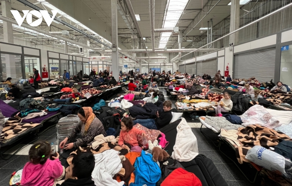 Người tị nạn ở trại biên giới Ba Lan-Ukraine gần cửa khẩu Korczowa. (Ảnh: VOV)