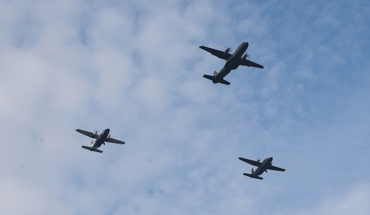 Hai chiếc máy bay lập tức thiết lập đội hình trên không, kiên nhẫn chờ đợi chiếc C212-400 thứ ba rời đường băng để hợp thành đội hình mũi tên - biểu tượng của tinh thần tiên phong và sức mạnh Không quân.