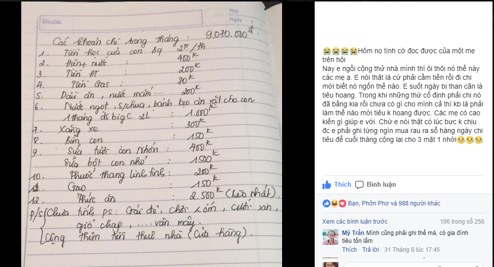 “Hôm nọ tình cờ đọc được của một mẹ trên hội. Nay em ngồi cộng thử nhà mình thì ôi thôi nó thế này các mẹ ạ. Em nói thật là cứ phải cầm tiền rồi đi chi mới biết nó ngốn thế nào. Em suốt ngày bị than vãn là tiêu hoang. Trong khi những thứ cố định phải chi nó đã bằng kia rồi chưa có gì cho mình cả thì không biết là phải làm thế nào mới tiêu không hoang được. Các mẹ có cao kiến gì giúp e với. Chứ e nói thật có lúc bực không chịu được em phải ghi từng nghìn mua rau ra sổ hàng ngày chi tiêu để cuối tháng cộng lại cho 3 mặt 1 nhời".