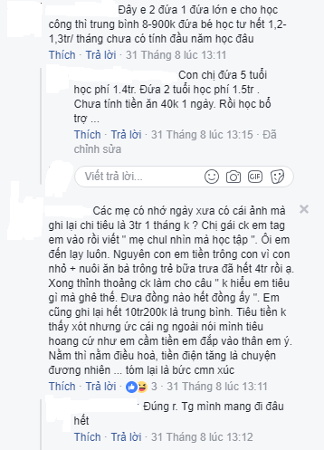 Facebook N.T.L bình luận: “Nhà mình 2 vợ chồng. Ông bà. Một đứa con và cô em chồng còn hết 28 triệu 1 tháng mà vẫn thuộc vào dạng tằn tiện.không mua quần áo, các thứ linh tinh. Mom tiêu vậy là tiết kiệm rồi”.