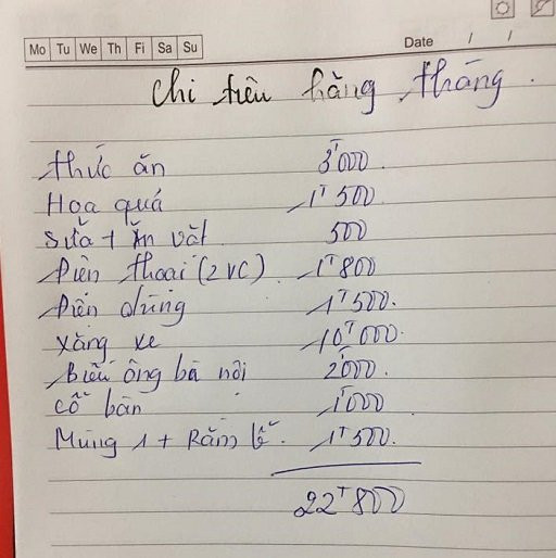 Theo đó, các khoản chi trong tháng mà chị H. liệt kê bao gồm: