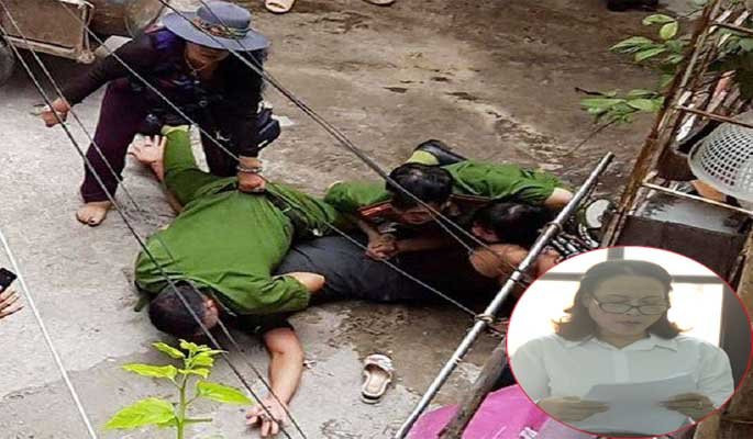 Thấy vậy, tổ công tác lao vào khống chế anh Cường tại chỗ, còn bà Nguyệt chạy đến để can ngăn. Trong khi giằng co, một cán bộ công an bị bà Nguyệt kéo tuột áo khỏi vị trí cài trong quần và làm rơi biển hiệu.