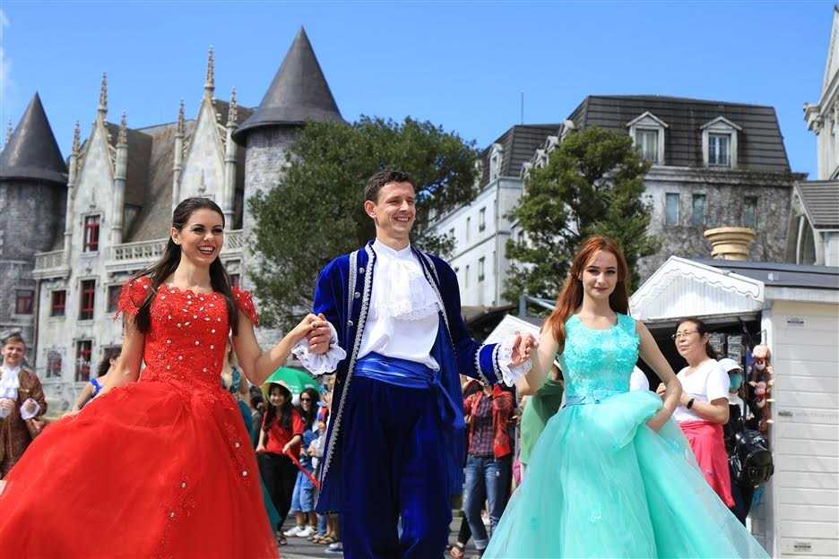 Đoàn nghệ thuật biểu diễn di chuyển vòng quanh Làng Pháp, từ khách sạn Morin tới khu vực nhà thờ Saint Denis, đài phun nước, quảng trường Du Dôme... Du khách tưởng mình như lạc bước giữa khung trời Châu Âu rộng mở, xứ sở của những lễ hội đường phố vui tươi bất tận