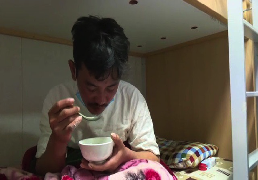 Các ngư dân ăn vội cơm để lấy sức sau nhiều ngày đói lả vì chống chọi với sóng biển.