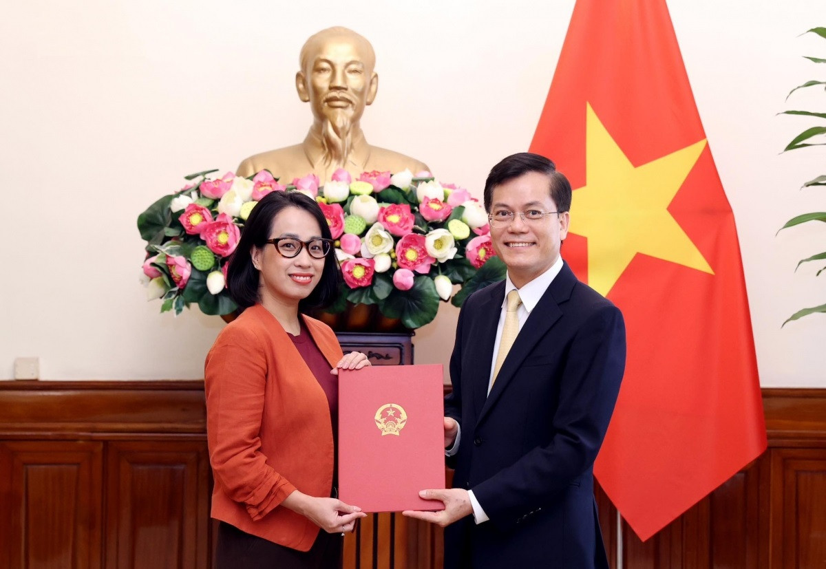 Thứ trưởng Bộ Ngoại giao Hà Kim Ngọc trao quyết định của Bộ trưởng Ngoại giao bổ nhiệm bà Phạm Thu Hằng giữ chức Quyền Vụ trưởng Vụ Thông tin Báo chí kiêm Người phát ngôn Bộ Ngoại giao. (Ảnh: Hải Hà)