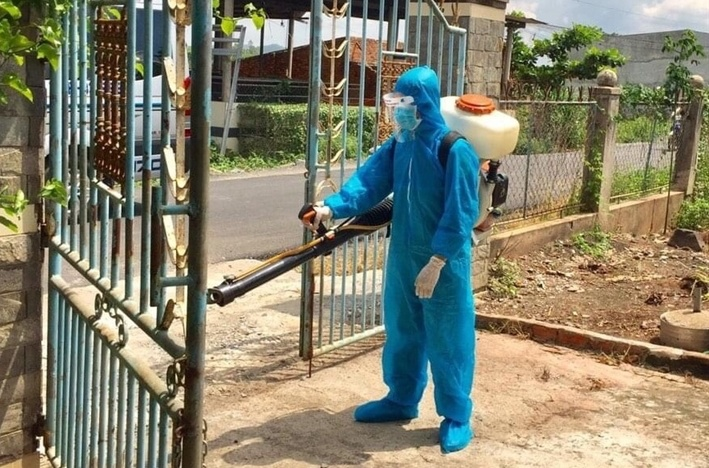 Lực lượng chức năng phun khử trùng tại huyện Châu Đức.