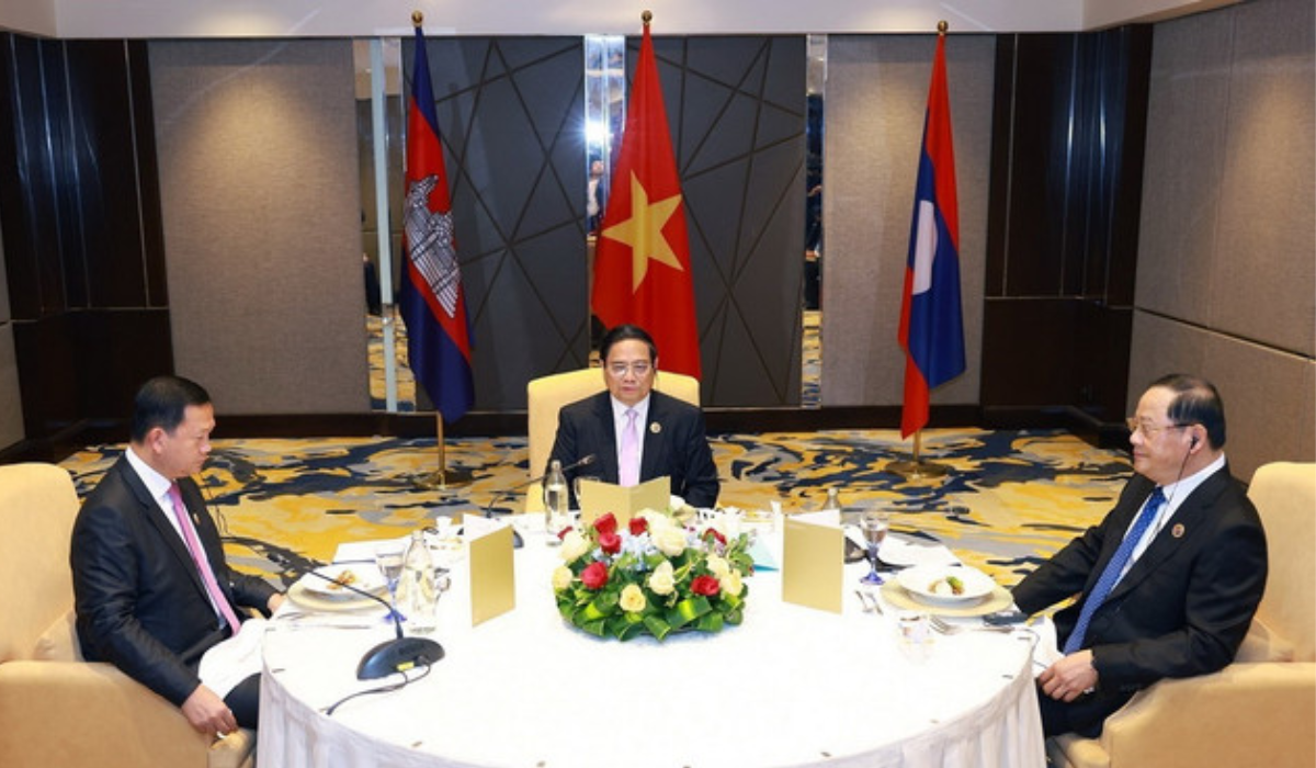 Thủ tướng Phạm Minh Chính cùng Thủ tướng Lào Sonexay Siphandone và Thủ tướng Campuchia Hun Manet. (Ảnh: Dương Giang/TTXVN)