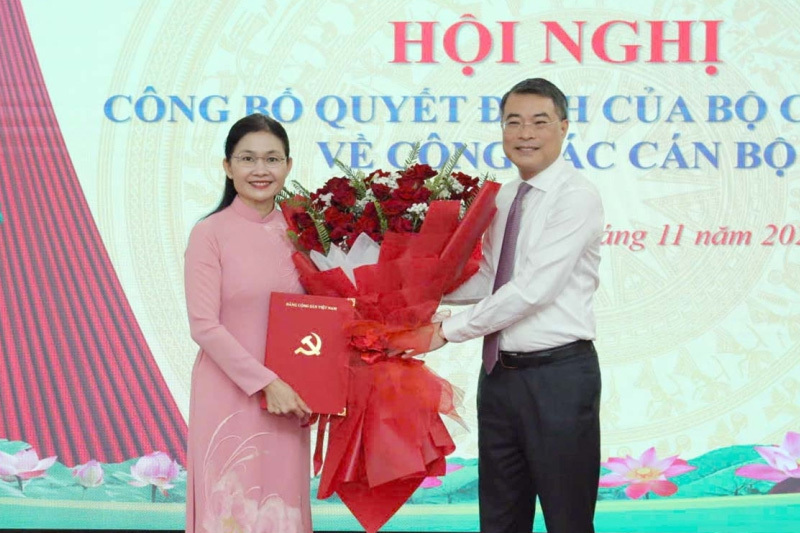 Ủy viên Bộ Chính trị, Bí thư Trung ương Đảng, Trưởng Ban Tổ chức Trung ương Lê Minh Hưng trao Quyết định và tặng hoa chúc mừng bà Tôn Ngọc Hạnh. (Ảnh: Báo Bình Phước)