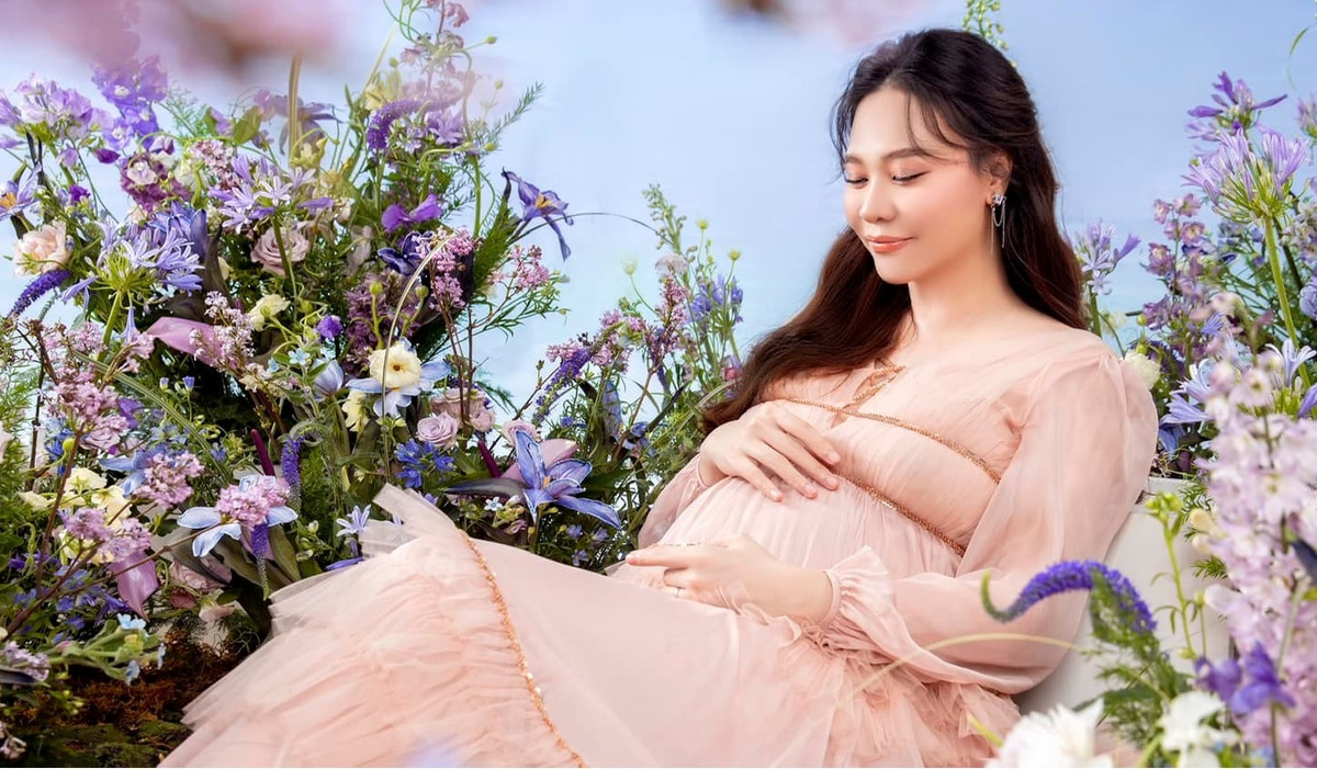 Dù bụng đã khá lớn, Đàm Thu Trang vẫn giữ được hình thể mảnh mai, gương mặt sắc nét và làn da trắng mịn không tỳ vết.