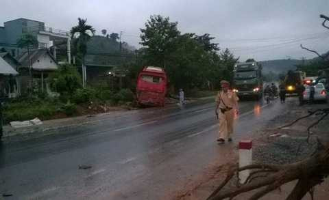 Vụ tai nạn liên hoàn khiến xe khách Thành Bưởi bị đẩy về phía trước khoảng 10 mét. Xe khách Phương Trang do anh Thiện điều khiển bị lao lên lề đường bên trái và tông vào trụ điện bên đường mới dừng lại.