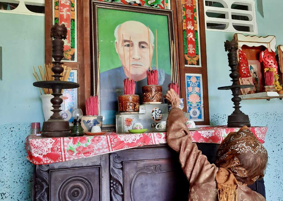 Cụ Nguyễn Thị Anh thắp nén hương cho cha chồng - cố Nghệ nhân dân gian Nguyễn Long Phi.